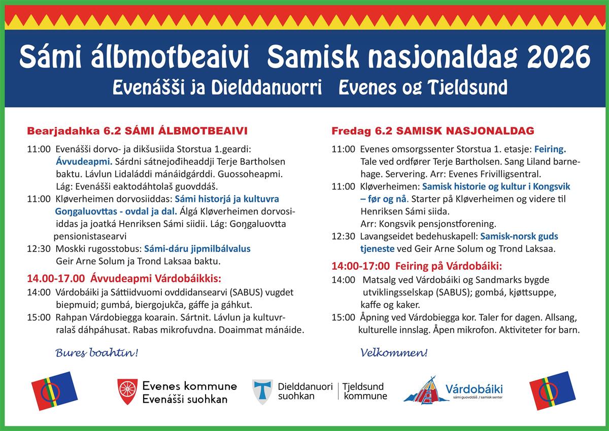 Evenes kommune, Tjeldsund kommune og Várdobáiki samisk senter samarbeider om samisk måned og samisk nasjonaldag. Programmet for Samisk måned og Samisk nasjonaldag er på plass. Mye som skjer i kommunene.