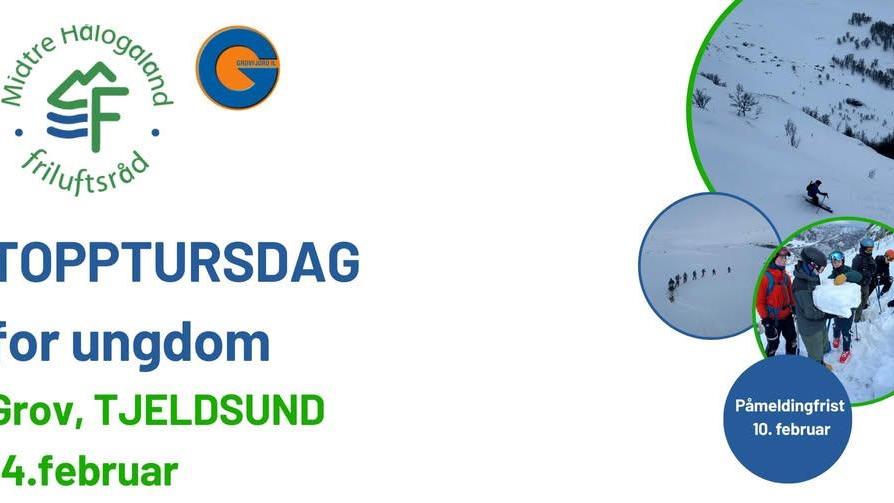 Bli med på topptur-dag for ungdom Midtre Hålogaland Friluftsråd i samarbeid med Grovfjord idrettslag arrangerer en topptur-dag for ungdom i alderen 13-18 år lørdag 14. februar! NB! Påm...