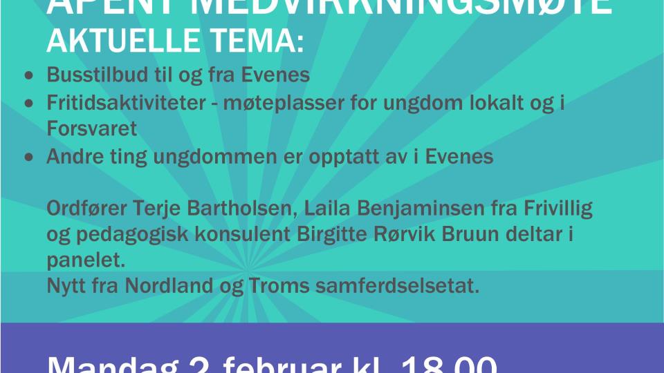Ungdom - bli med på medvirkningsmøte Ungdomsrådet inviterer kommunens og forsvarets ungdommer fra 13-20 år til åpent medvirkningsmøte med aktuelle tema mandag 2. februar. Medvirkning er v...