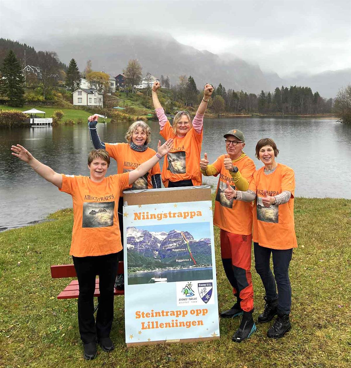 - Enda gjenstår en del før man kan si dette sikkert, men vi jobber med det for øyet. Vi er ganske sikre på at ei skjerpatrapp kommer til å bli positivt for hele kommunen vår. Det kommer til å få mange av våre egne innbyggere til å mosjonere i trappa, og besøkende kommer til å lokkes hit for å gå i trappa vår. Niingstrappa vil utvilsomt bli en fantastisk attraksjon som, med mange besøkende, vil legge igjen kroner for næringsliv, lag og foreninger og selve kommunen. Vi har tro på prosjektet, og at dette vil bidra til trivsel og bolyst i vår fine kommune, forteller Katrine Røtnes, Ingunn Ottem, Åse Elvemo, Frank Johansen og Solfrid Pedersen i prosjektgruppa.
