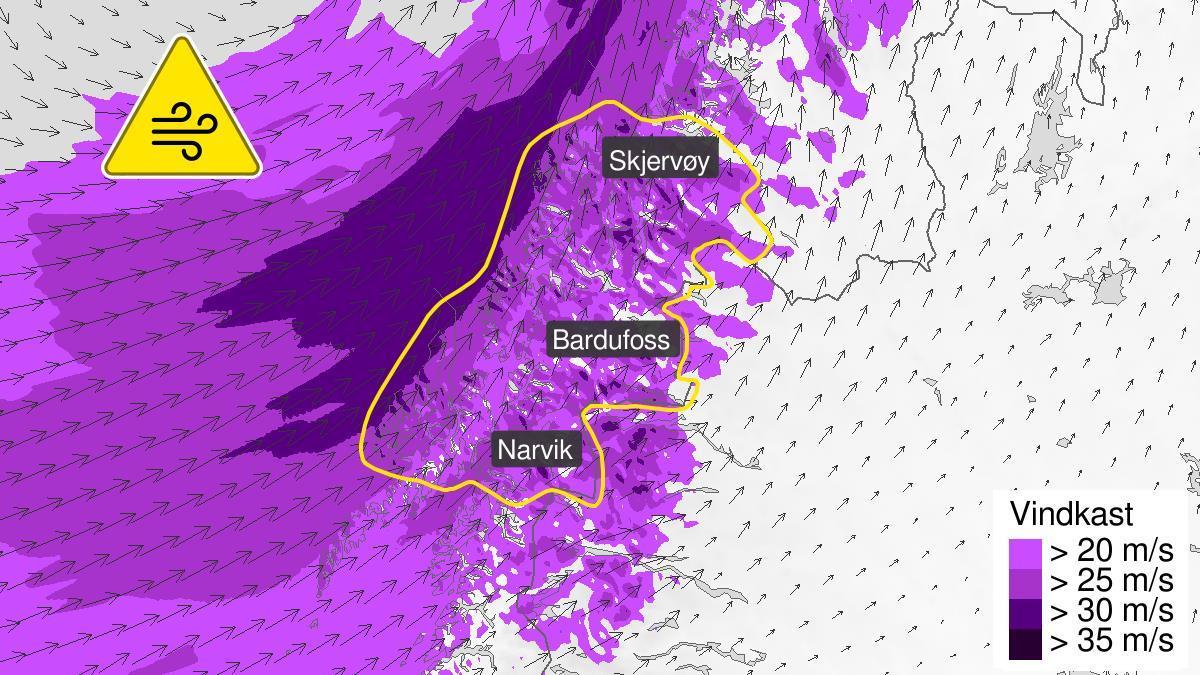 På onsdag ventes betydelig snøskredfare i region Ofoten. Snøskredproblem er vedvarende svakt lag (flakskred) og fokksnø (flakskred). Kraftig vind og snø gjør at skred kan løsne av seg selv. Unngå skredterreng og utløpsområder for skred. Det er stor usikkerhet i hvordan vedvarende svake lag reagerer på snølast. Skred kan bli store.