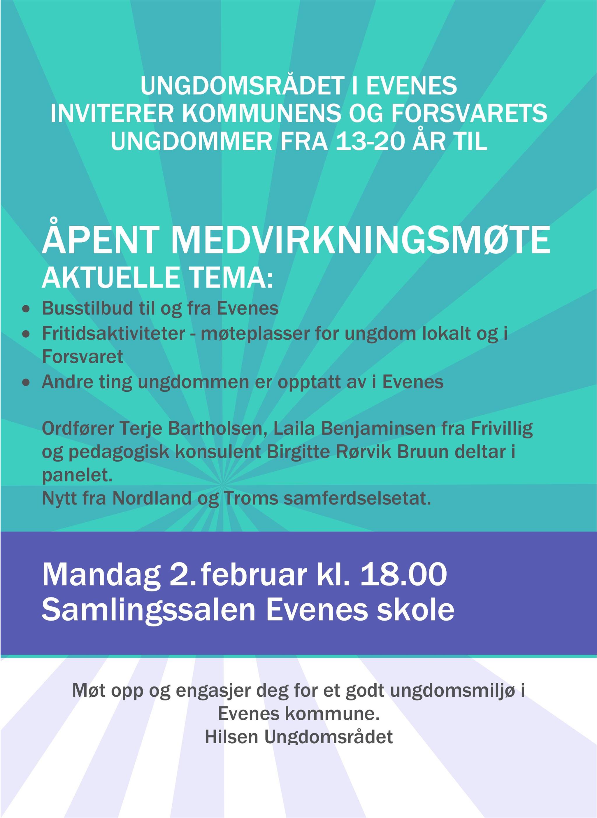 Ungdom - bli med på medvirkningsmøteUngdomsrådet inviterer kommunens og forsvarets ungdommer fra 13-20 år til åpent medvirkningsmøte med aktuelle tema mandag 2. februar. Medvirkning er viktig og vi håper flest mulig blir med. Publisert 28.01.2026 11.00 Sist endret 30.01.2026 15.53