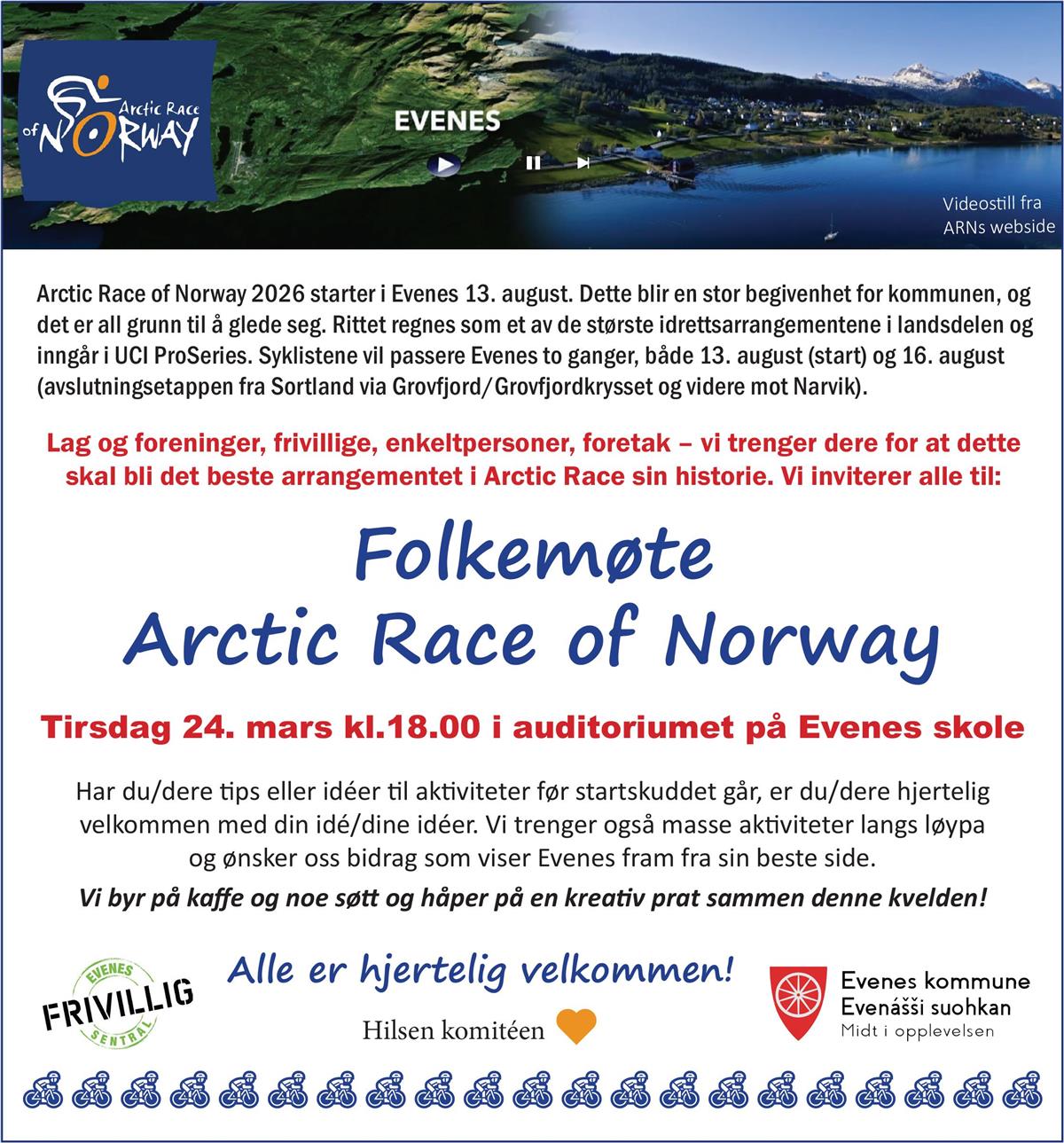 Vi viser til EvenesNytt og minner om folkemøtet tirsdag 24. mars kl.18.00. Prosjektgruppa/komiteen i Evenes for Arctic Race of Norway håper på stort oppmøte og god dialog.